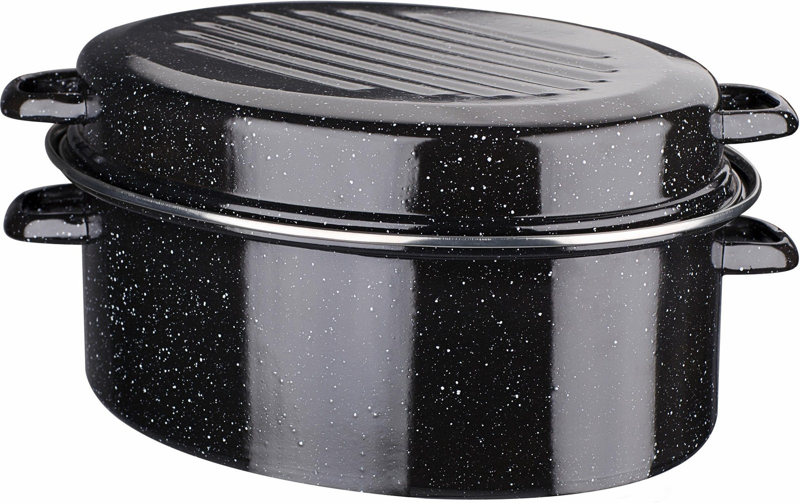 صينية تحميص بيضاوية من GSW مصنوعة من الفولاذ المطلي بالمينا بحافة من الكروم. مثالية للطهي التقليدي. لونها أسود مرقط بالأبيض. مزودة بأخاديد لتصريف السوائل على الجزء العلوي لتوزيعها بشكل مثالي. يمكن استخدام كلا الجزأين بشكل منفصل. مثالية لمن يعانون من الحساسية. آمنة للاستخدام في الفرن. مناسبة لجميع أنواع المواقد، بما في ذلك المواقد الحثية.